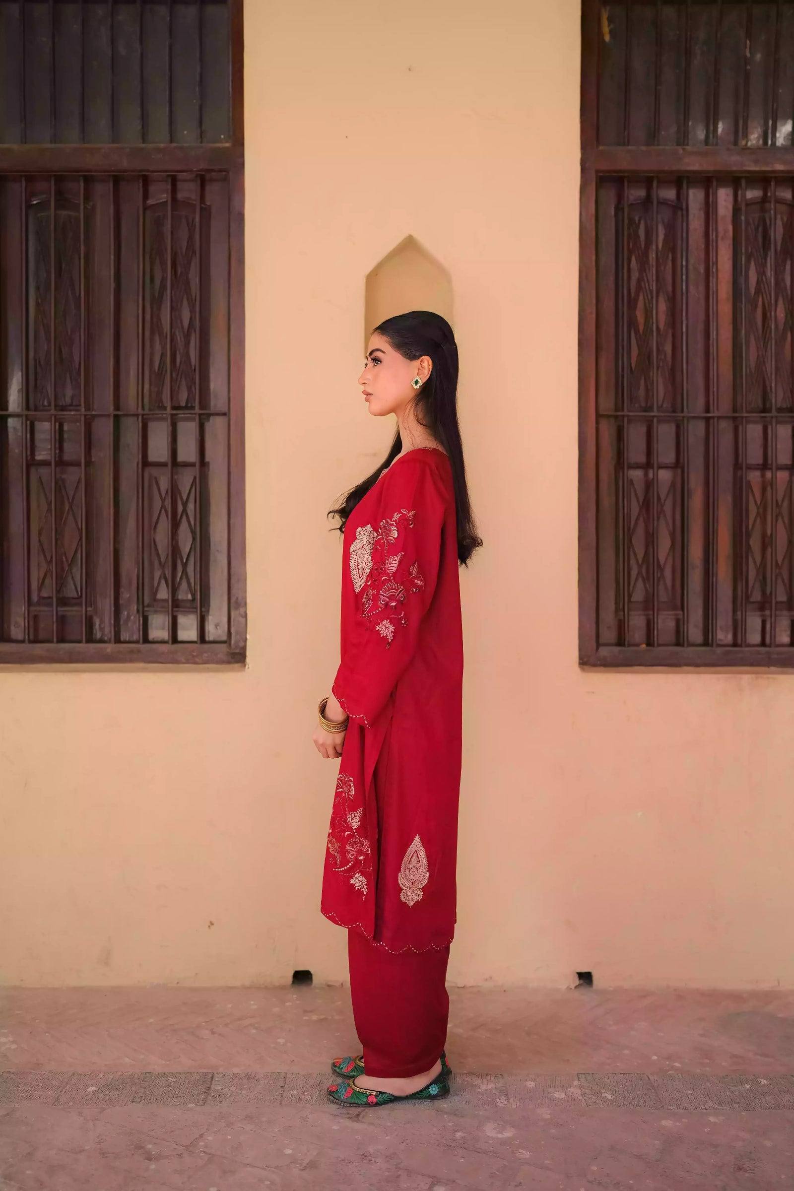 A beautifully adorned trouser that gives a hint of rich hue of red exudes warmth and celebration, making Haya a perfect choice for festive gatherings, family occasions, or serene winter evenings. With its graceful silhouette and timeless detailing and it embodies femininity, elegance, and tradition — a true ode to classic beauty.
