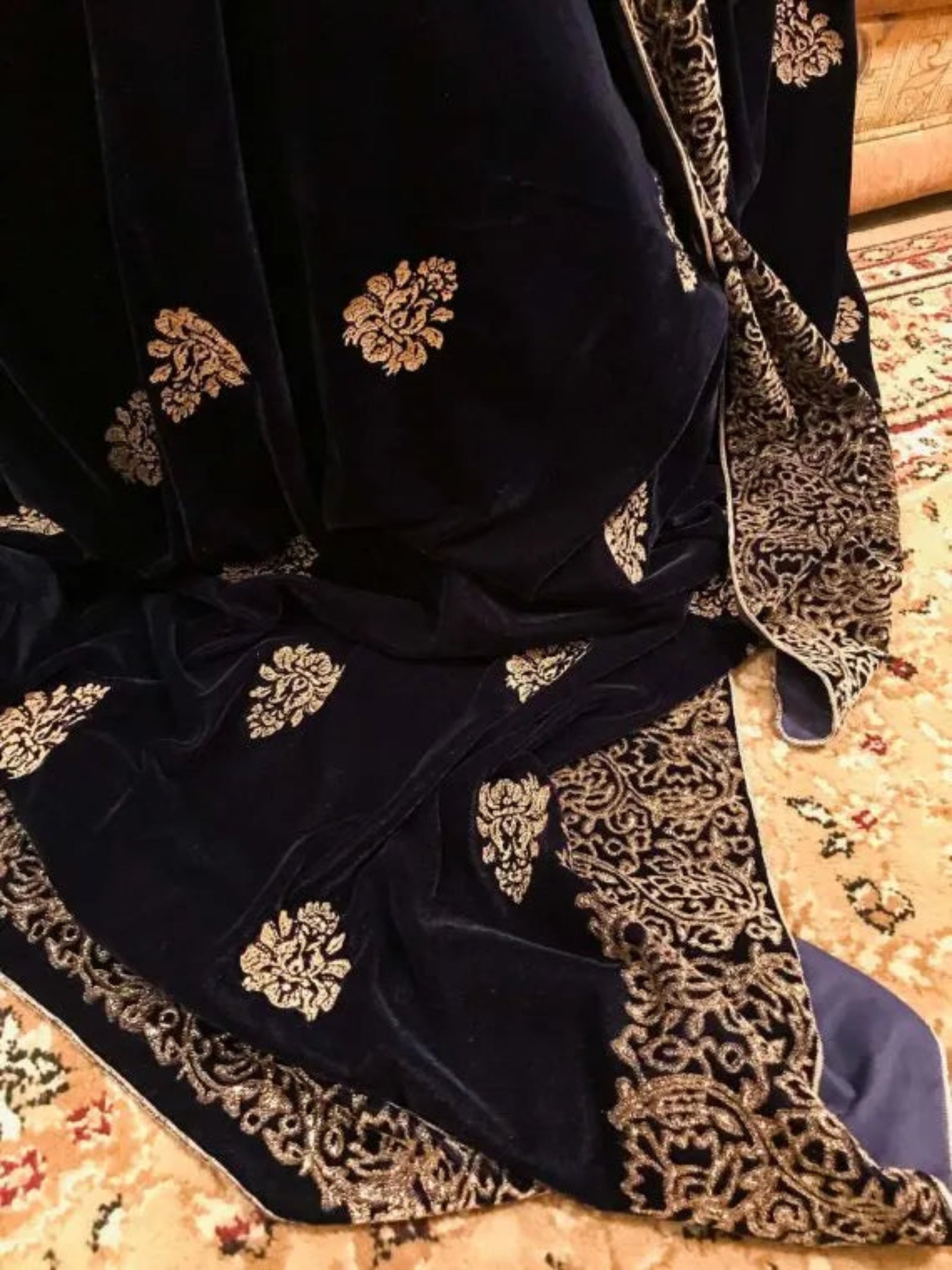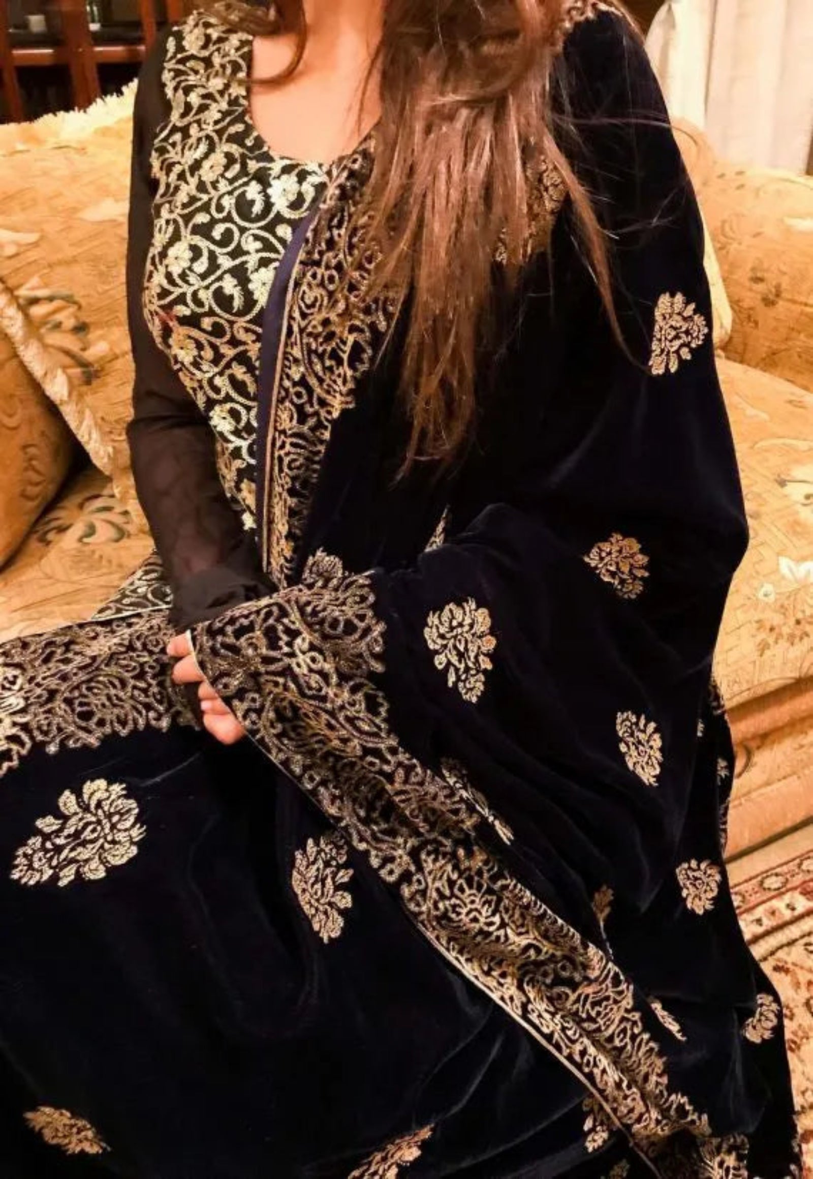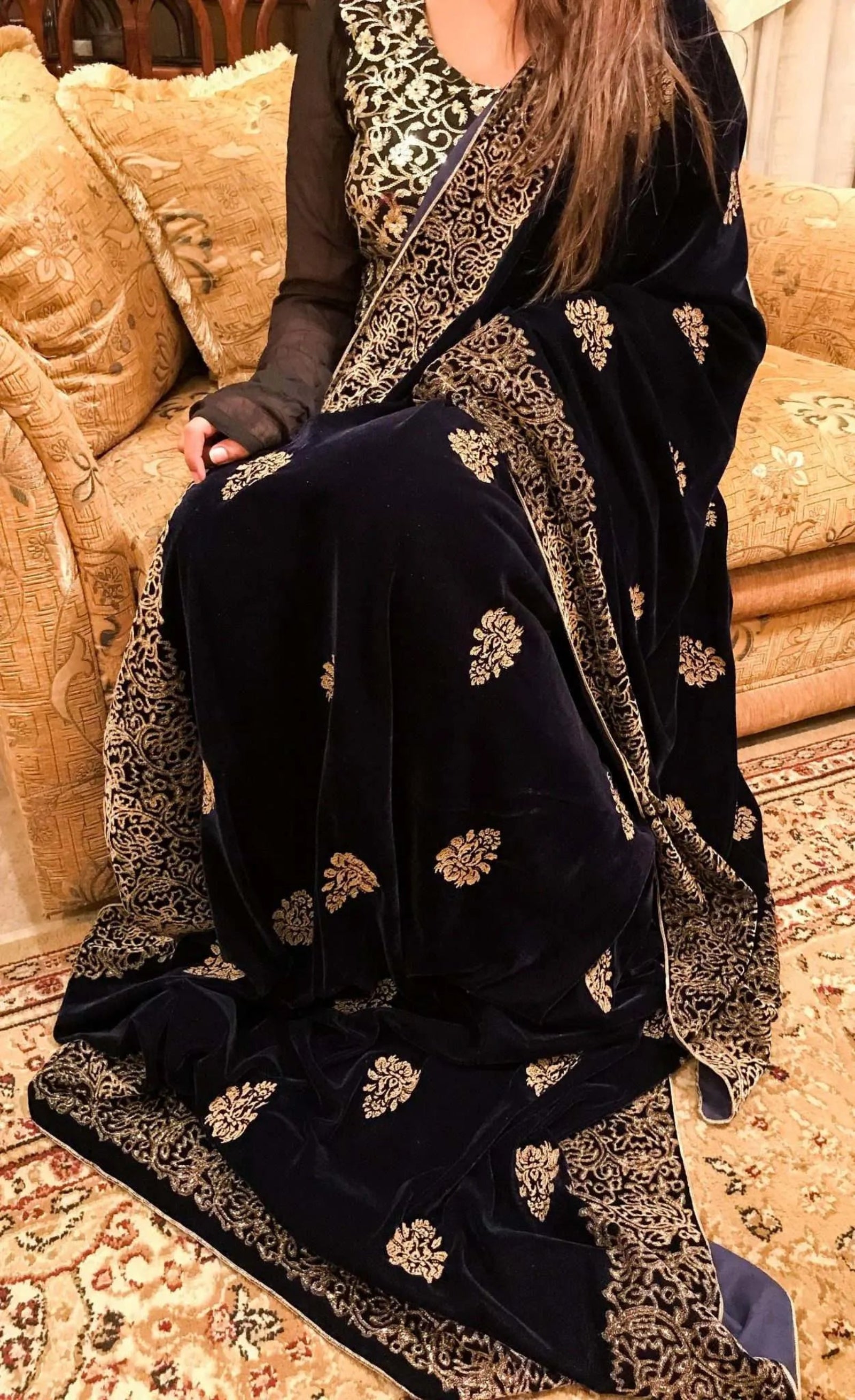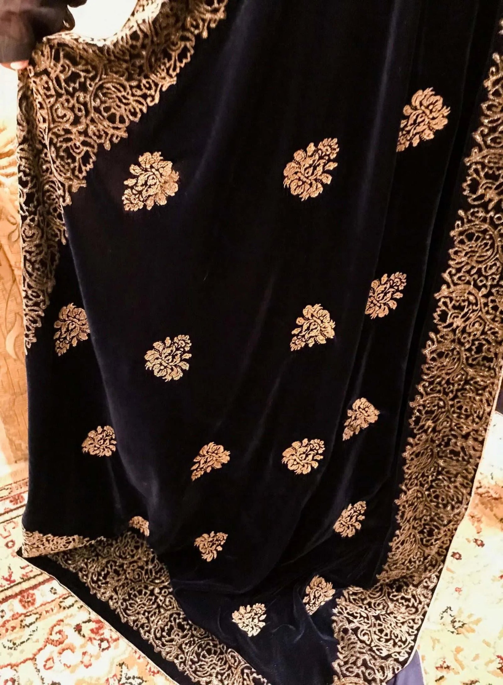 Discover Navy Blue Floral Velvet Shawl is a masterpiece of elegance and traditional artistry, designed to make a lasting impression. Featuring a thick floral block-printed border on all four sides, this shawl beautifully frames its luxurious navy blue velvet base. The center is adorned with delicate small screen-printed motifs, adding depth and charm to the overall design. To ensure both durability and refined detailing, all edges are meticulously finished with a golden thread outline, giving the shawl a graceful, polished look.