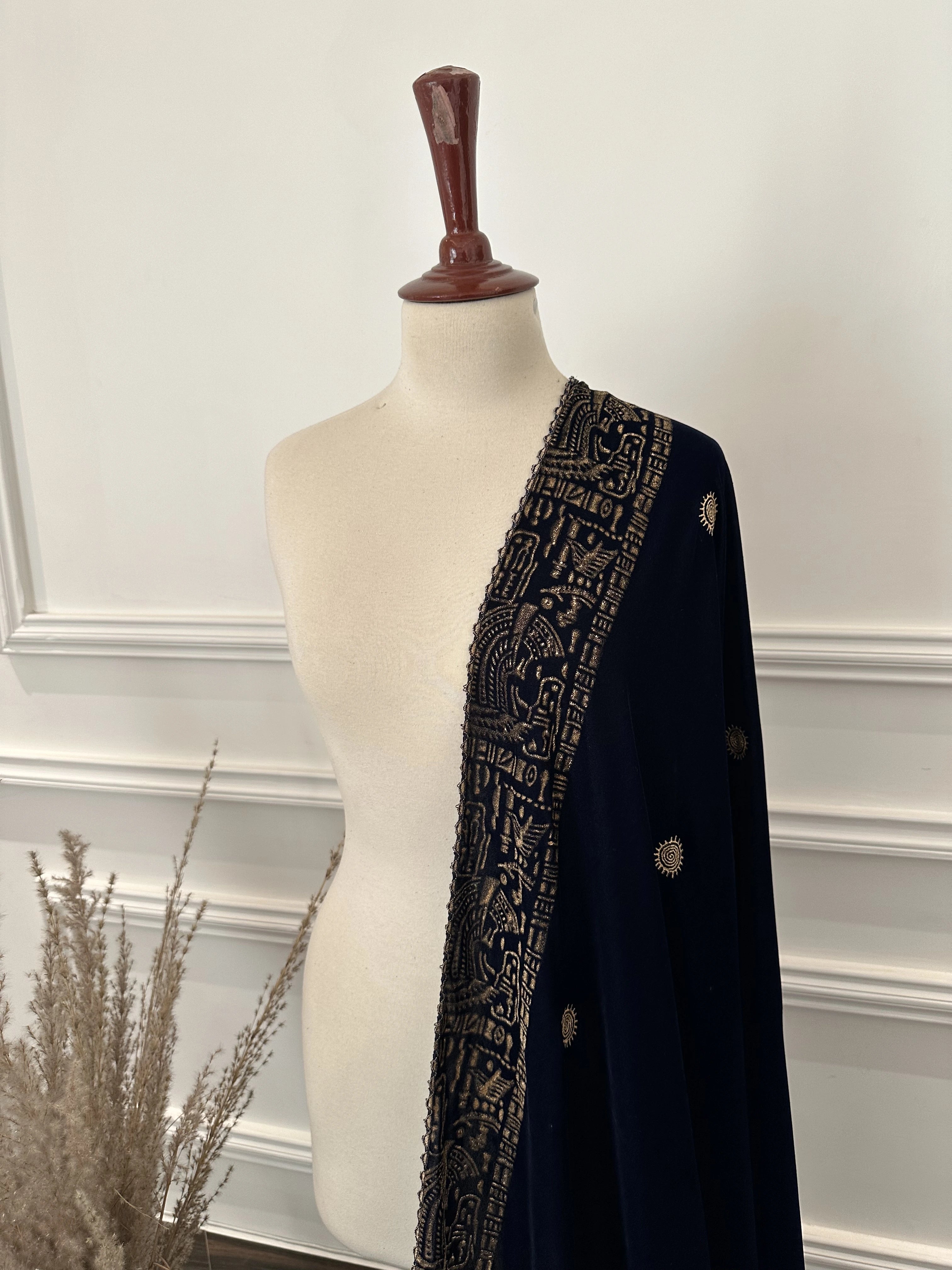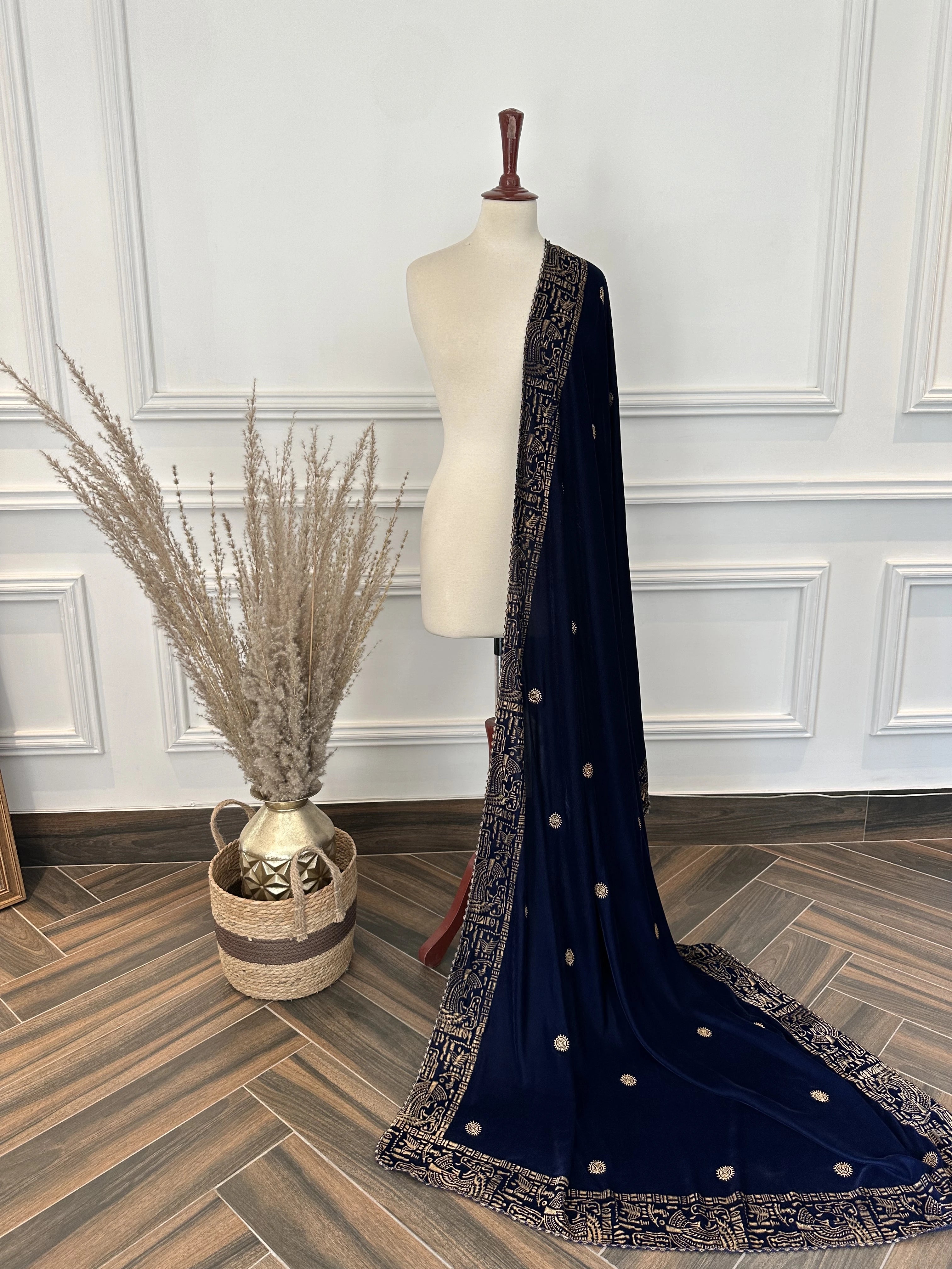 This elegant blue and gold block printed shawl is a perfect blend of traditional craftsmanship and timeless sophistication, making it a must-have for any festive wardrobe. Crafted from premium velvet fabric, it showcases intricate gold Print along a delicate traditional border, beautifully enhanced with an all-over golden motif chatta. The finely detailed floral accents catch the light gracefully, adding a subtle yet luxurious shimmer.