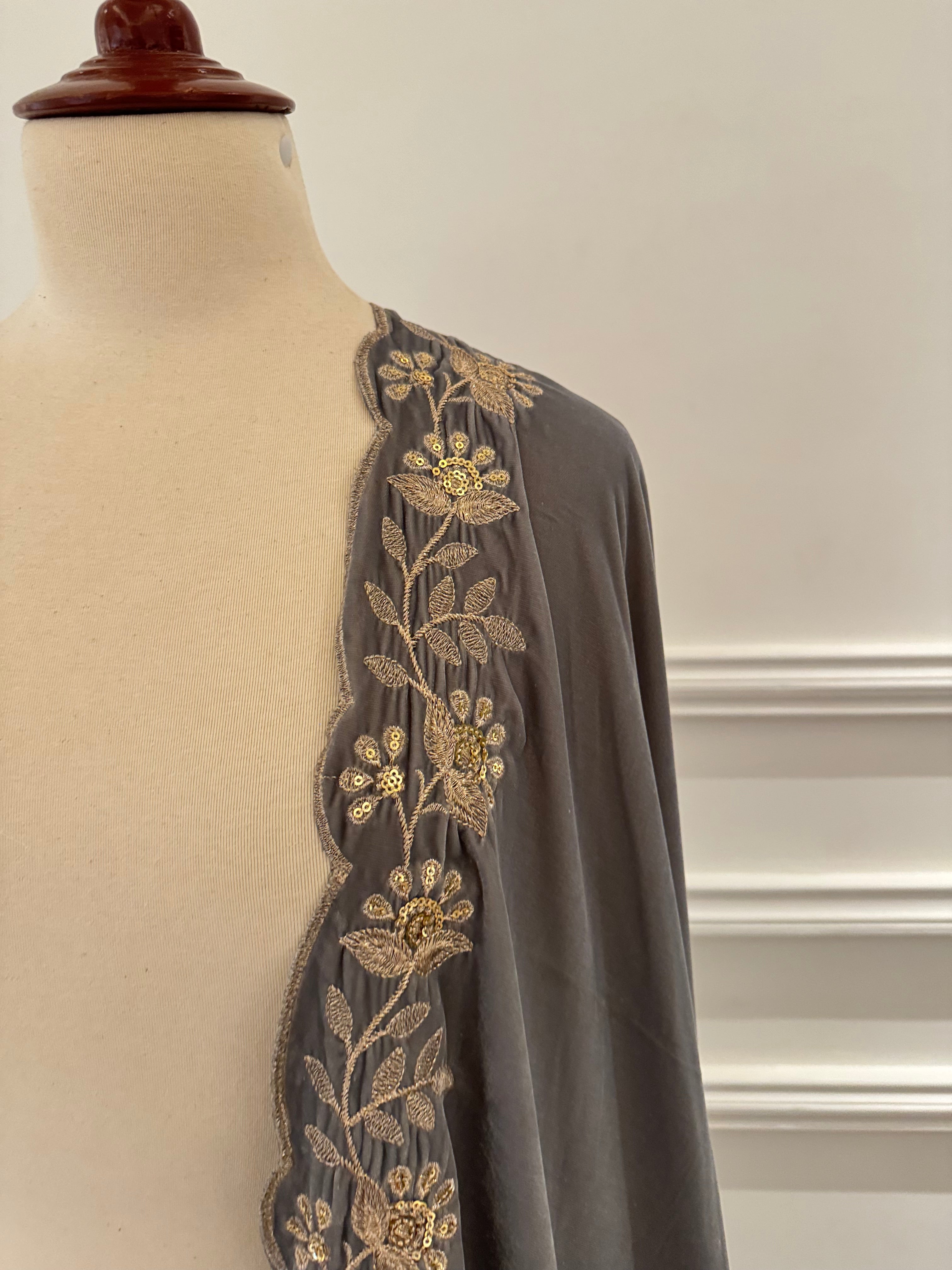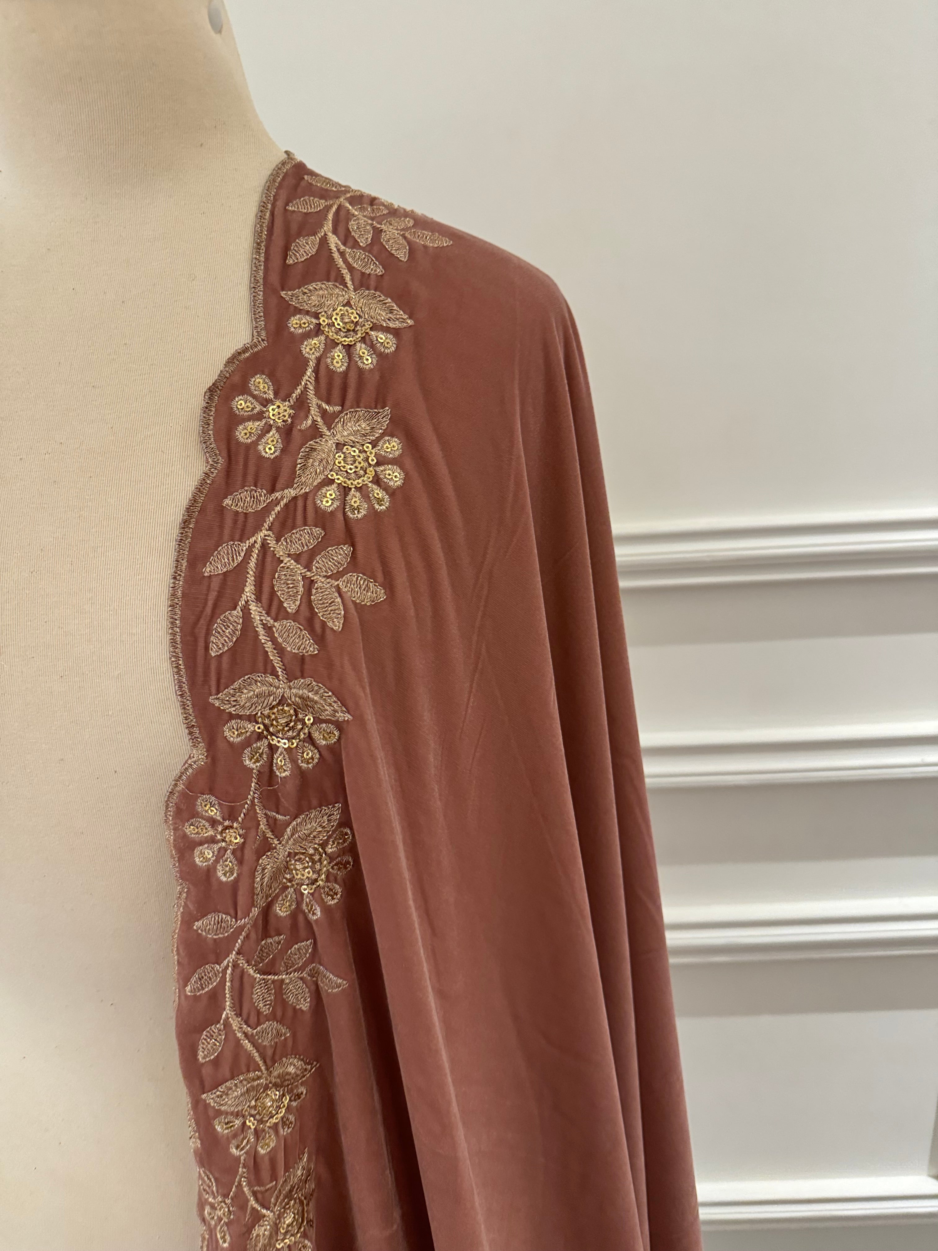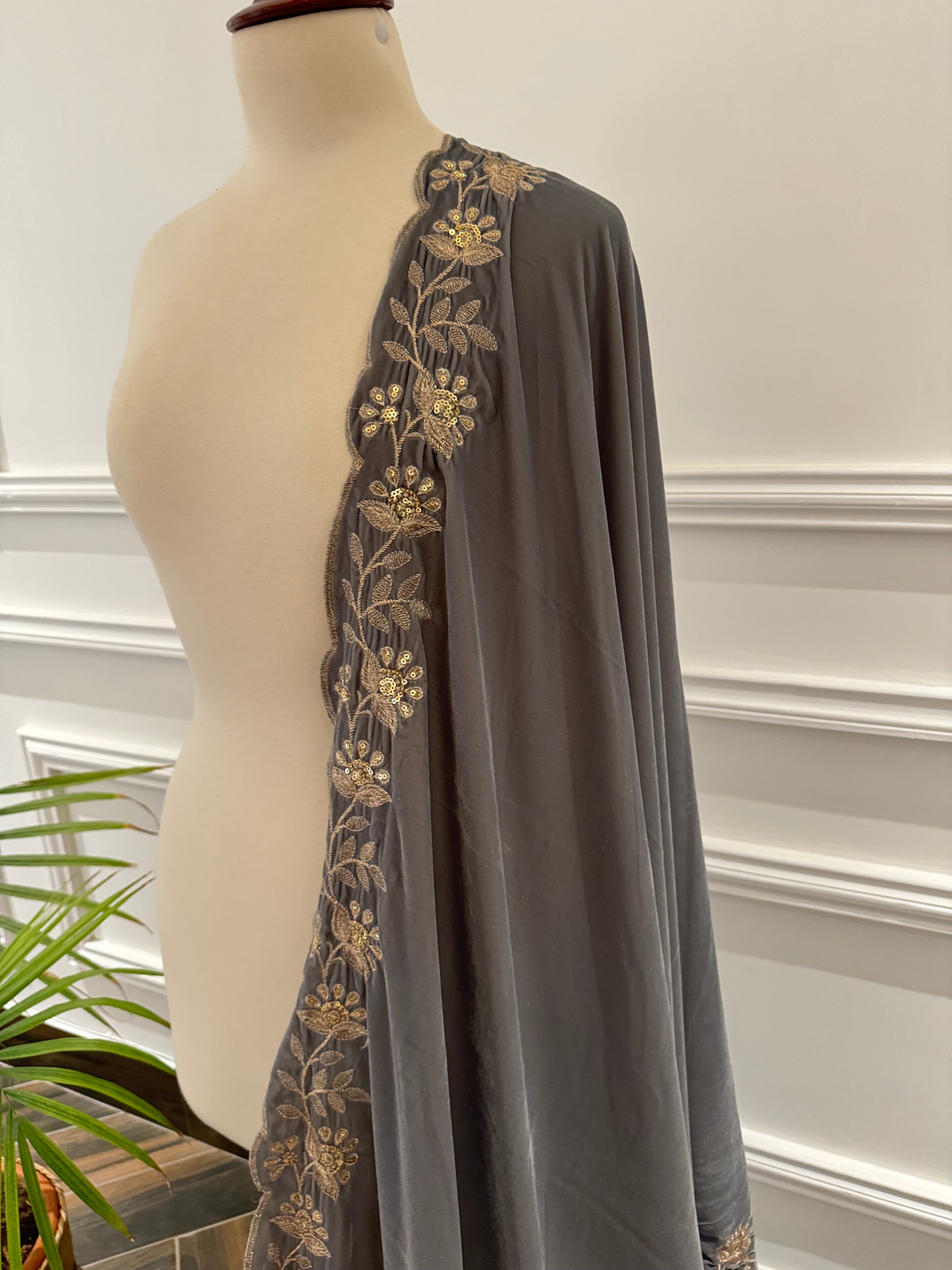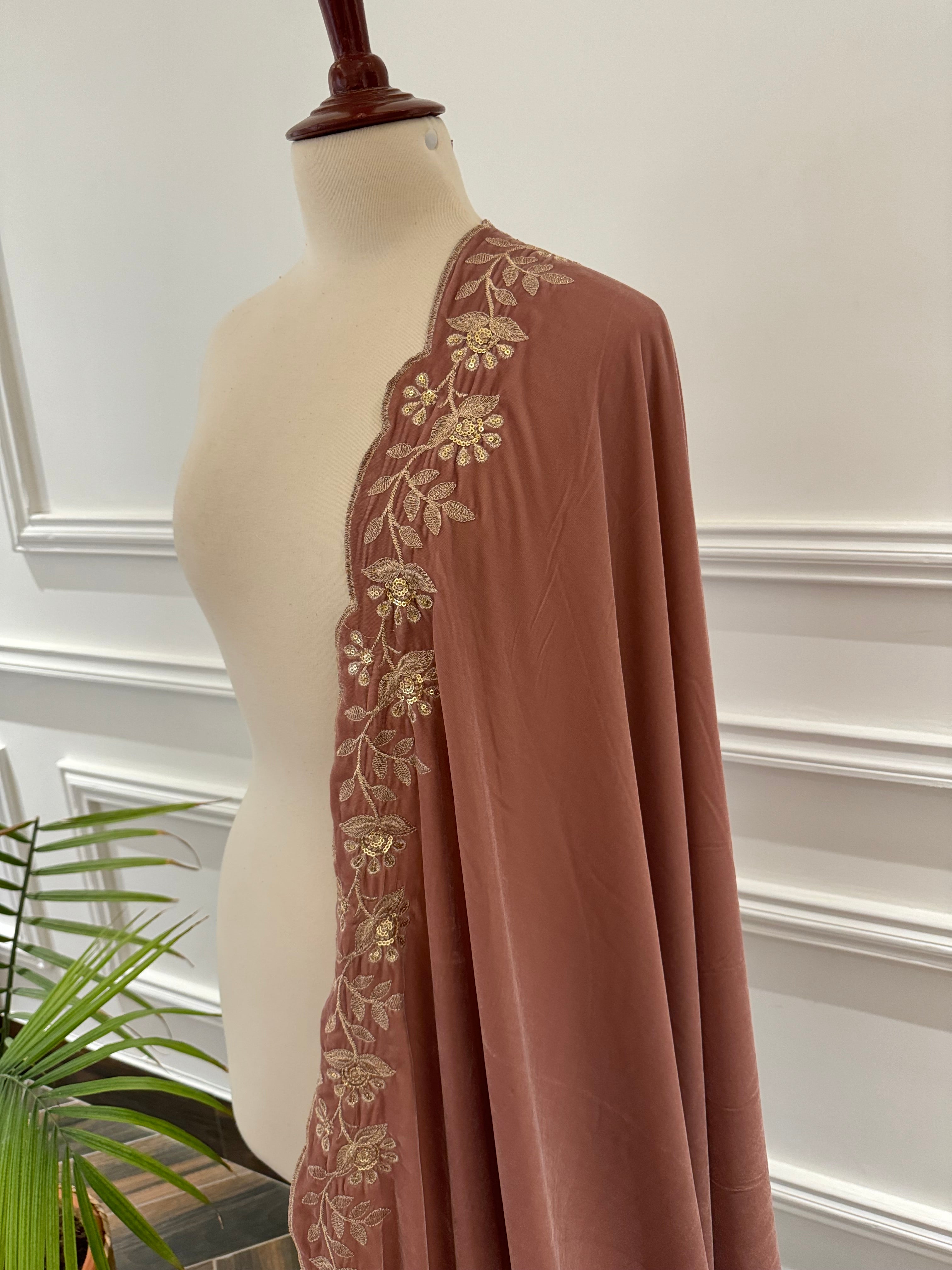 Wrap yourself in elegance with our exquisite pastel velvet shawl, designed to elevate any ensemble. This luxurious piece features intricate floral tila and sequined cutwork embroidery along the sides, adding a touch of sparkle and sophistication. The heavy floral bunches adorning the palu create a stunning focal point, making it perfect for both casual outings and special occasions. Soft to the touch and rich in color, this shawl not only provides warmth but also transforms your look with its artistic craftsmanship.