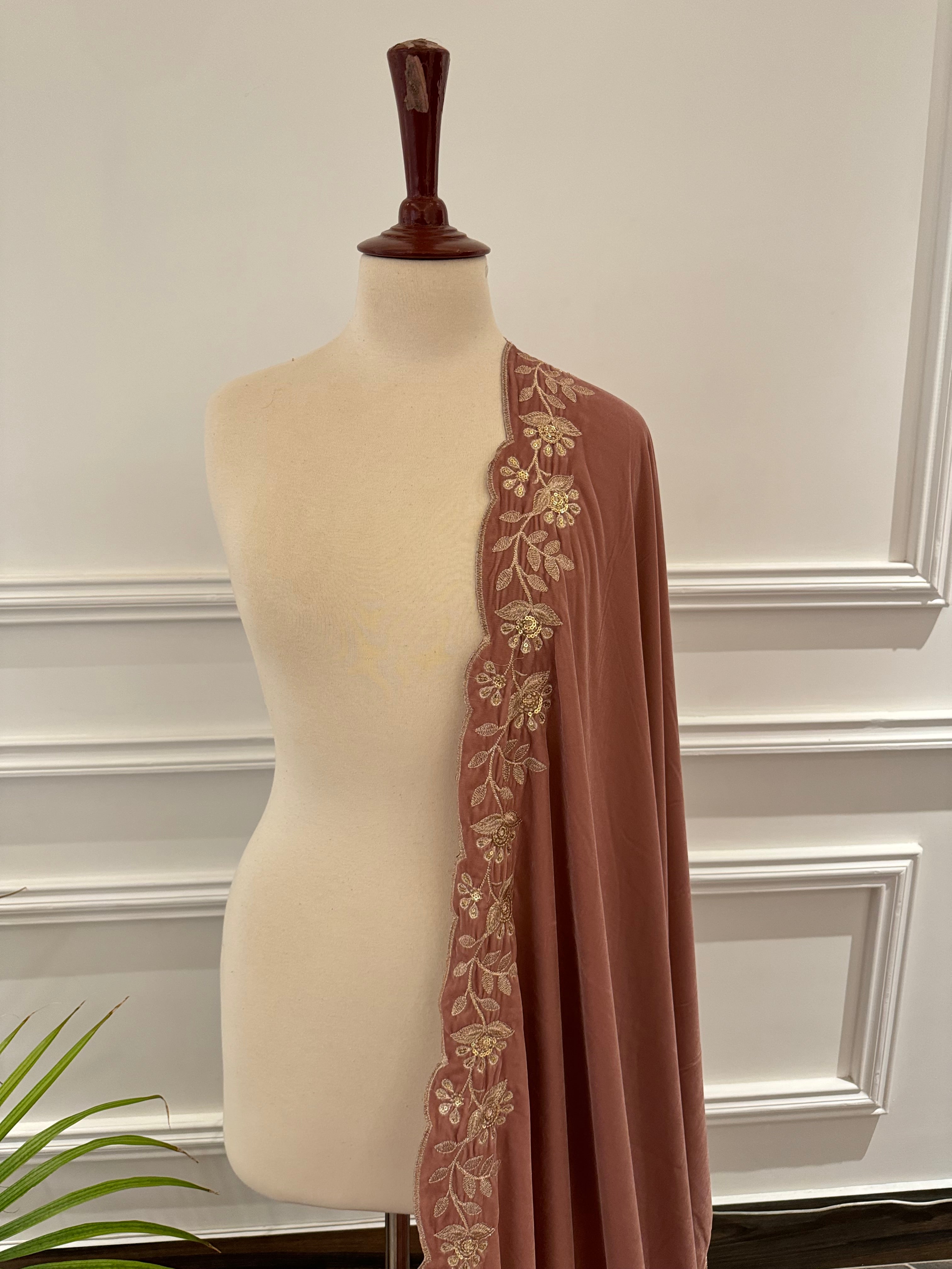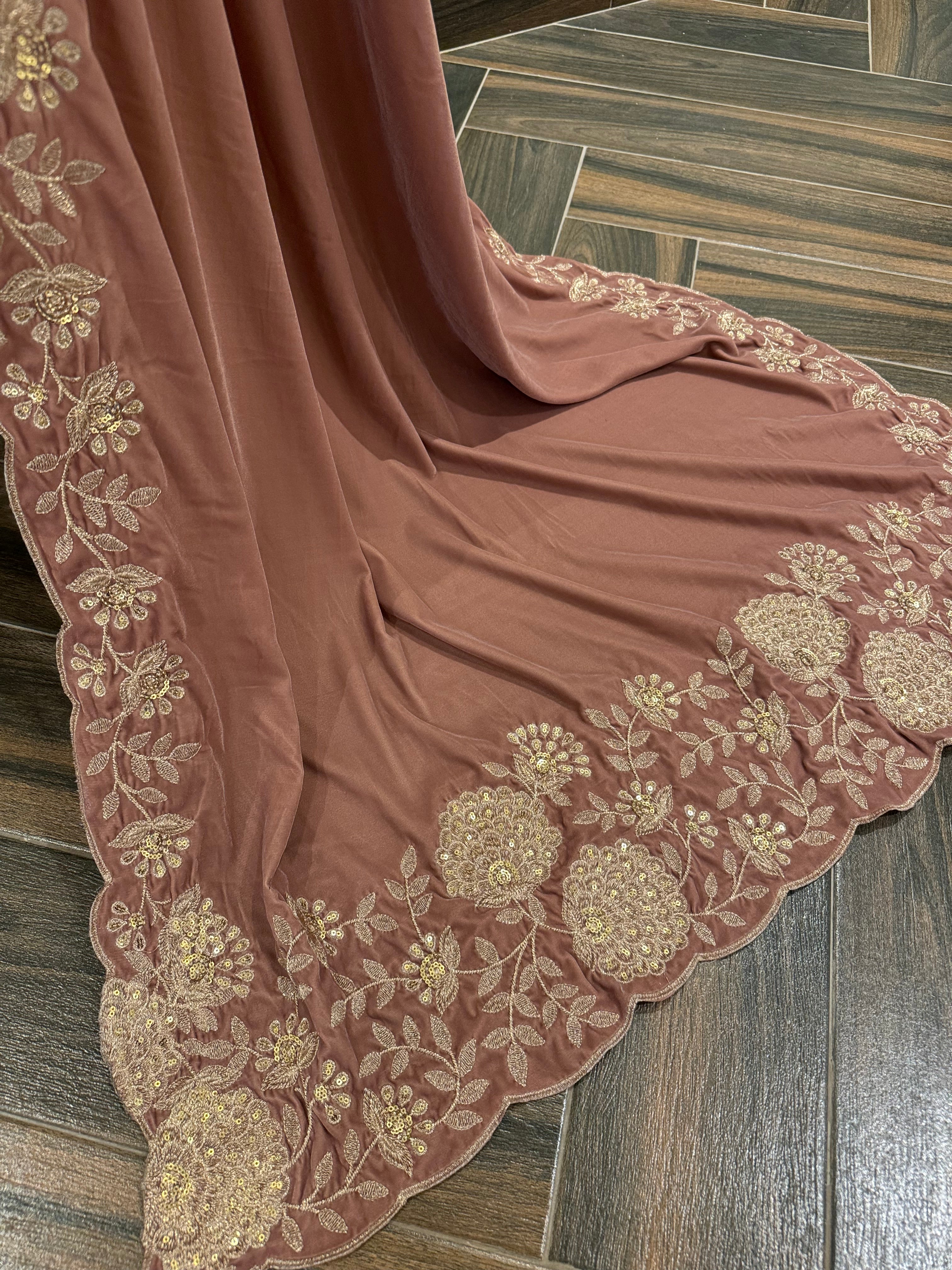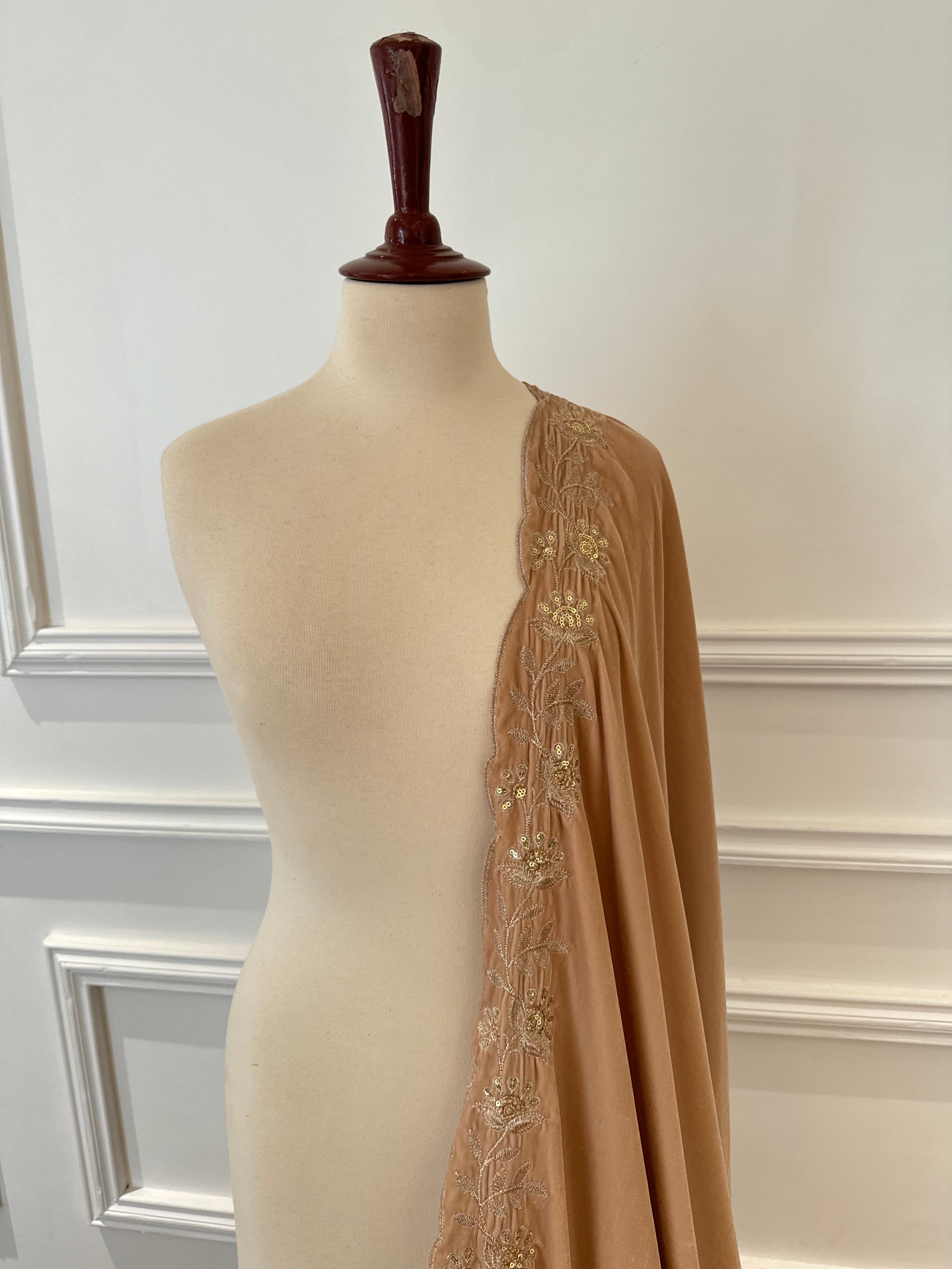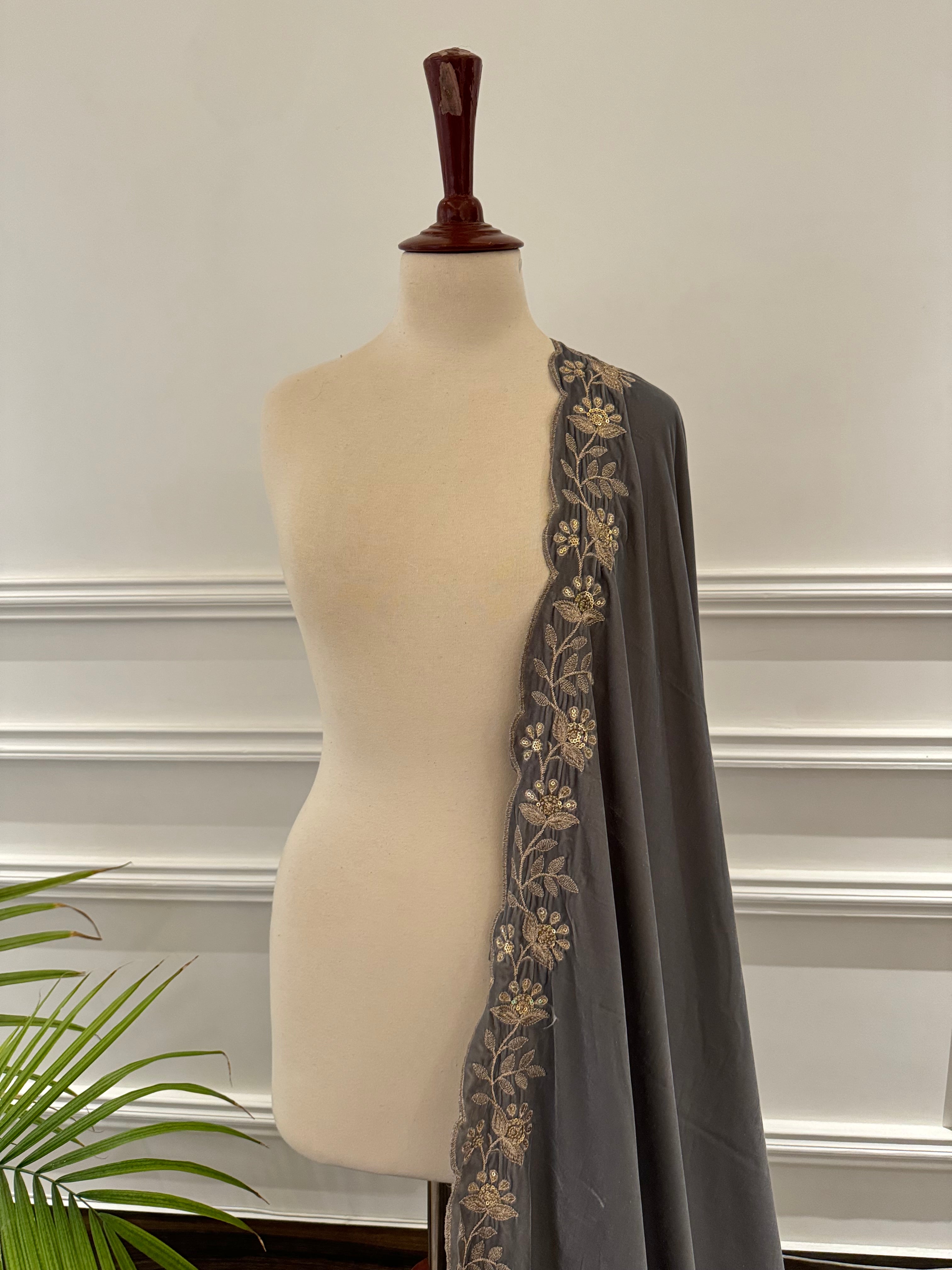 Wrap yourself in elegance with our exquisite pastel velvet shawl, designed to elevate any ensemble. This luxurious piece features intricate floral tila and sequined cutwork embroidery along the sides, adding a touch of sparkle and sophistication. The heavy floral bunches adorning the palu create a stunning focal point, making it perfect for both casual outings and special occasions. Soft to the touch and rich in color, this shawl not only provides warmth but also transforms your look with its artistic craftsmanship.
