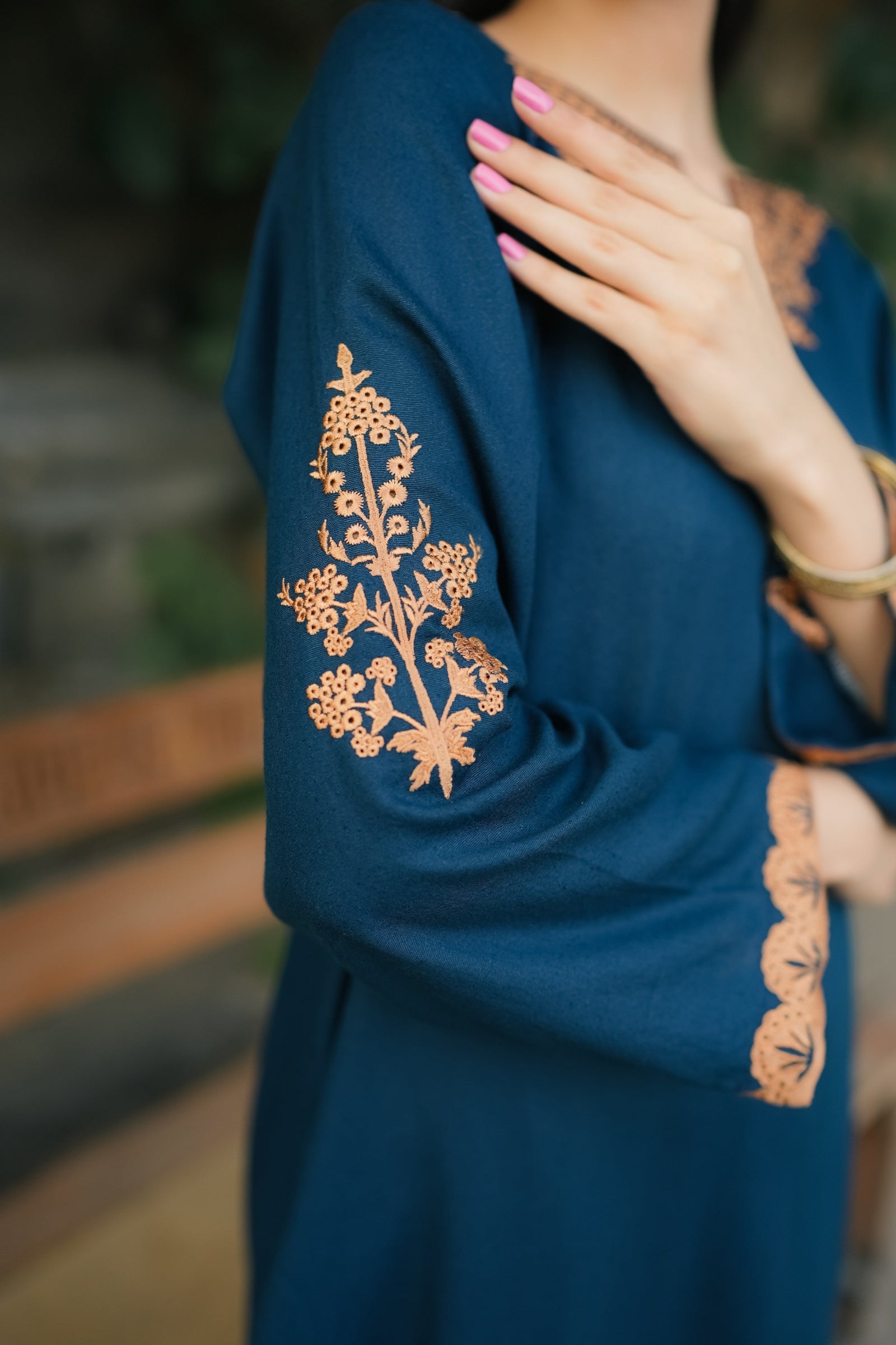 Radiating poise and warmth, Zarnoor celebrates the art of subtle contrast. Crafted from rich zinc blue fabric, this ensemble is adorned with delicate light Mustard embroidery that glows like threads of dawn against the cool base. The intricate detailing on the neckline and sleeves adds depth, while the graceful patterns across the shirt evoke a timeless allure.